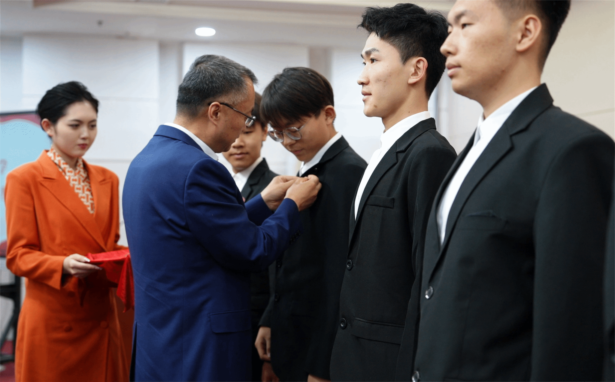 王延明为青马学员佩戴青马徽章。